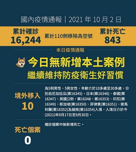 臺灣中央流行疫情指揮中心10月2日公布新增10例COVID-19確定病例,均為境外移入;另確診個案中無新增死亡。