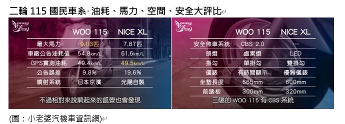 在二輪115級距中,國民車系主要競爭機種為三陽WOO115及光陽NICE XL115,自2016年WOO115推出後因貼合客層日常需求,長期霸榜人氣不衰。而NICE XL去年一月改款上市後,持續與WOO115爭奪115級距冠軍寶座。日前,小老婆汽機車資訊網針對兩車進行實車比較,其中WOO115實測油耗與公告油耗誤差最為接近,省油又有力實測達9.03ps,除此之外,以搭載日本京濱噴射引擎為傲的WOO115更有著同級車沒有的CBS2.0連動剎車系統大大縮短剎車距離39%,坐墊長度也為同級最長以及擁有同級最大21.6L車廂,符合消費者日常使用偶爾需要接送孩子、家人需求。