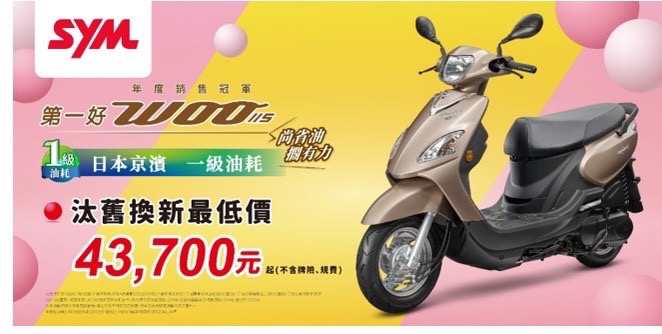 SYM女性通勤族及家庭用戶熱銷車款『第一好WOO115』,以3大DNA『好品質、好安全、好省油』及靈活輕巧車身廣受消費者喜愛,更是年度銷售冠軍長青樹,為慶祝雙十國慶三陽再加碼1,000元(禮券或中油加油卡),祭出汰舊最低價43,700元起(不含牌險、規費),讓你輕鬆好入手。