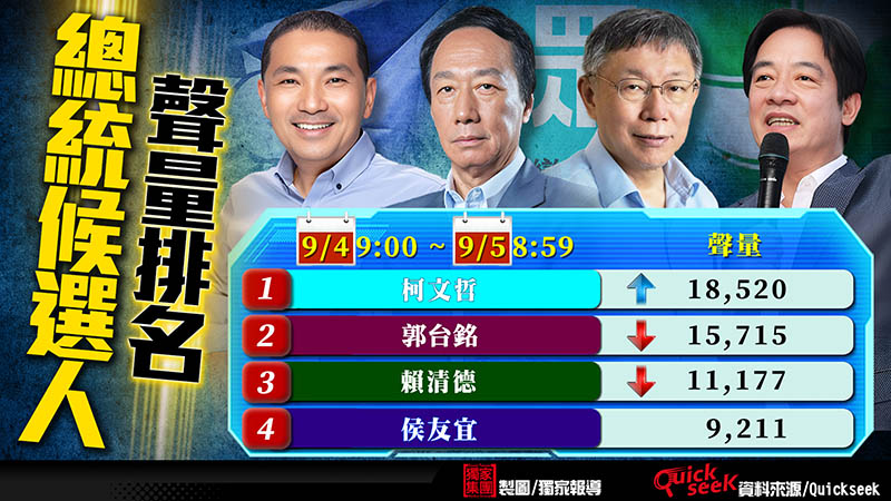 沉寂多日的柯文哲,昨(4)日終於拿回話語權,不但質疑了進口蛋圖利,對新藥上市速度慢,也有話說,因此柯P再次重回總統候選人聲量的冠軍寶座。根據QuickseeK 總統大選每日情報總統候選人聲量排名,9/4到9/5的潛在候選人聲量排名柯文哲躍升第一名,聲量是18,520 (上升2),第二名是郭台銘,聲量是15,715 (下降 1),第三名是賴清德 ,聲量是11,177 (下降1),第四名是侯友宜,聲量是9,211。