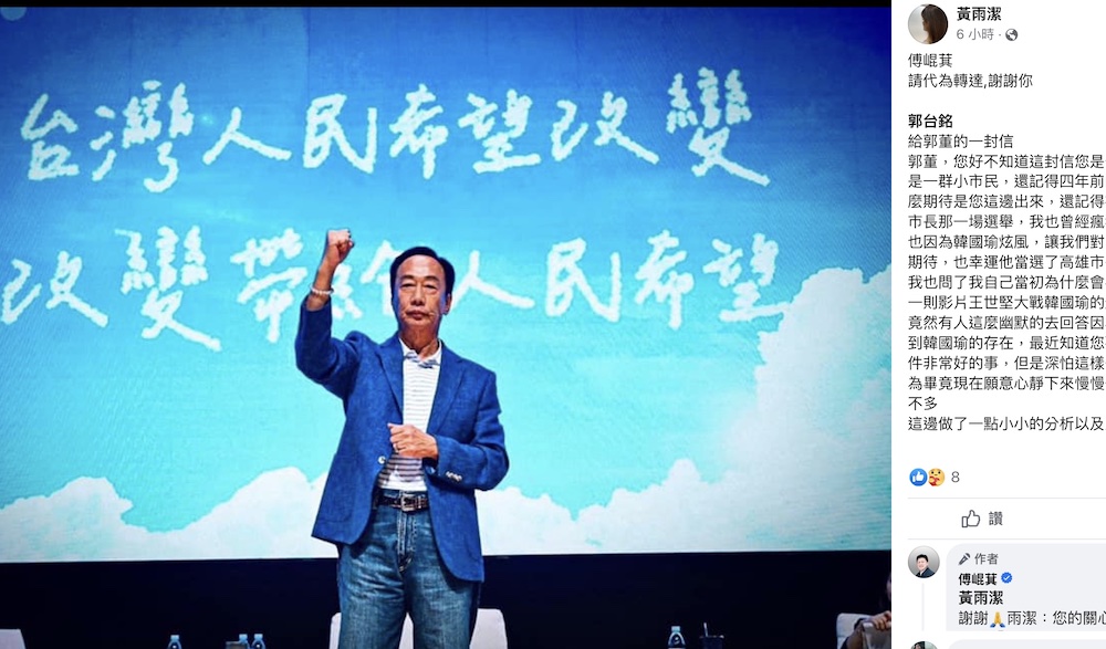 黃姓網友請傅崐萁代轉達這封信給郭台銘,據了解,這信已交付郭董父子。網友表示,四年前力挺郭董參選總統,最近知道郭董要出書,深怕民眾透過書來了解郭董太慢了,她急得透過留言來給郭董選戰建議。