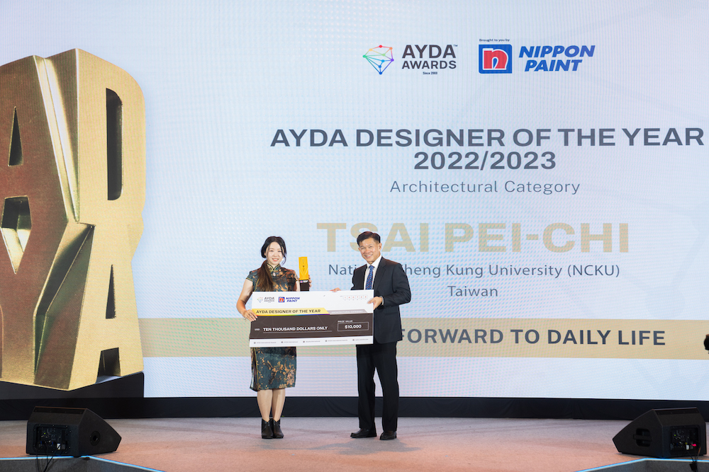 亞洲知名學生設計競圖AYDA Awards今年從來自15座城市金獎學生同台競逐下,代表台灣出賽的成功大學建築研究所蔡沛淇,以作品「日常嚮往」奪下建築組最高榮譽「年度設計師」榮譽,是台灣首次在這個競賽中獲得最高榮譽獎項,將獲得立邦塗料全額贊助,參加哈佛大學為期三週的Design Discovery Program暑期課程。