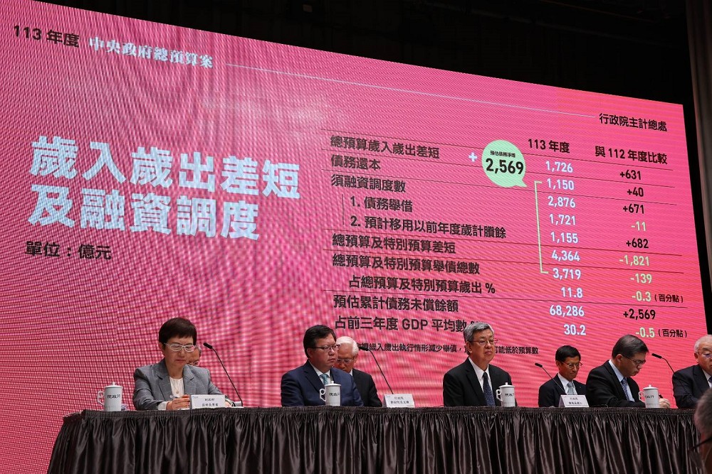 行政院24日院會通過113年度中央政府總預算案,歲入編列2兆7092億,較 112年度增加1296億、約增5%;歲出編列2兆8818億,較112年度增加 1927億、約增7.2%,歲入歲出差短1726億。另外,債務還本1150億,占稅課收入5%,尚須融資調度財源為2876億,將以舉借債務1721億及移用前年度歲計賸餘1155億支應。