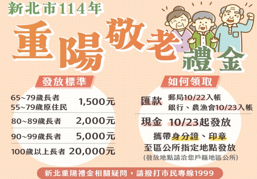 新北市社會局日前公布今(114)年重陽敬老金的發放時程,確保長輩們能即時領取市府的祝福。社會局表示,選擇匯款至郵局帳戶的長者,禮金將於今(22)日入帳;若選擇銀行或農漁會帳戶者,則於明(23)日撥款。市府除了提供實質的敬老金,也呼籲長輩和家屬務必慎防詐騙。