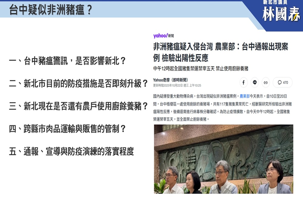林國春指出,新北市府應主動啟動跨局處防疫聯繫,針對養豬場、廚餘處理場、冷鏈物流中心及豬肉批發市場進行緊急稽查與檢測,並建立清晰的防堵動線與通報機制。