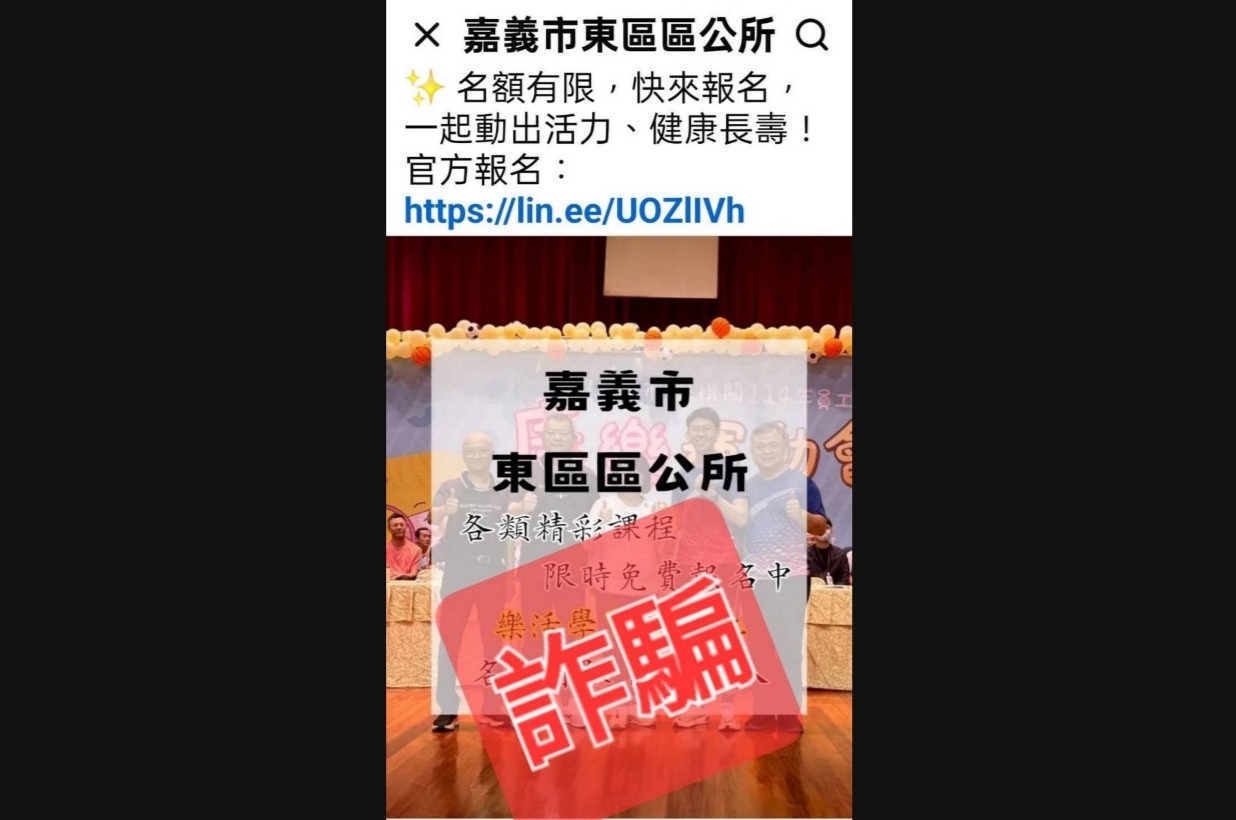 市刑大表示,10月5日傍晚,東區區公所職員發現,有假冒的臉書專頁,發布多項免費課程招募訊息,並要求民眾點擊連結加入Line好友留下個資。東區區公所主任吳勇杰接獲通報後,立即撥打165反詐騙專線,並在第一時間於區公所官方臉書發布澄清訊息,提醒民眾切勿上當。也隨即前往嘉義市警察局刑事警察大隊報案。隔天,西區區公所臉書,也出現同樣遭冒名的狀況。