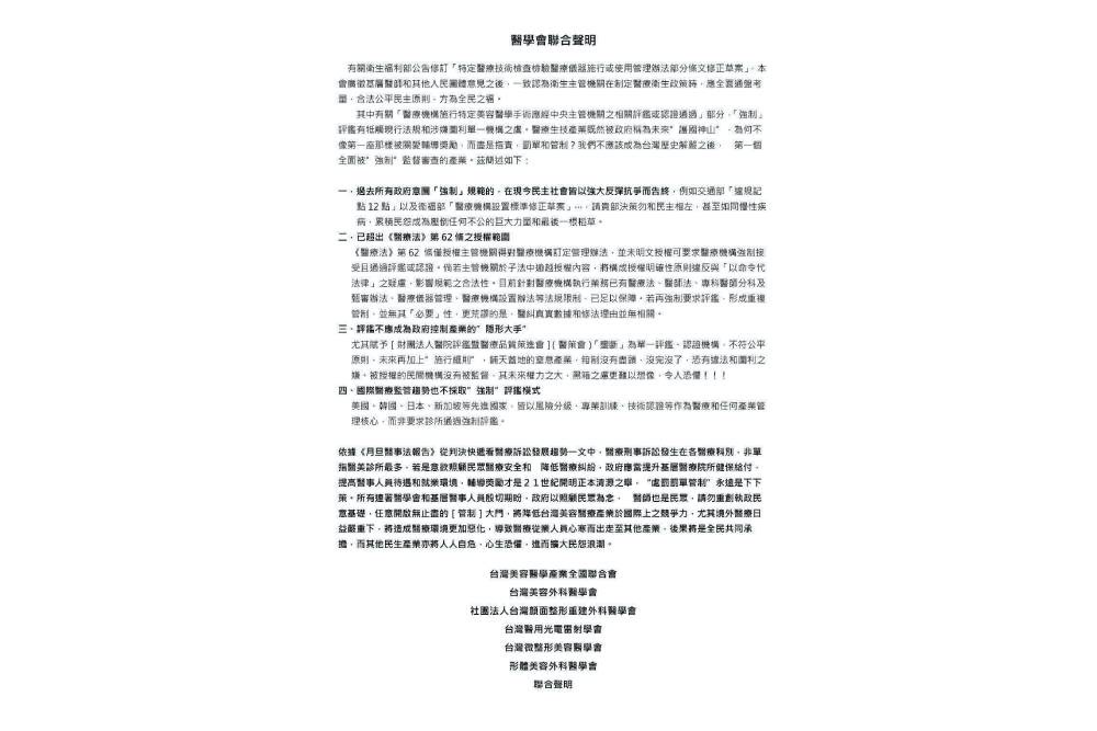 六大醫學會今(24)日聯合發表嚴正聲明,強烈反對衛生福利部推動修訂「特定醫療技術檢查檢驗醫療儀器施行或使用管理辦法」部分條文。醫界指出,衛福部長石崇良以「整頓醫美亂象、保障民眾醫療安全」為名,主張要求未受充分訓練的 PGY(畢業後一般醫學訓練醫師)不得執行美容醫學手術,並須回院補訓;表面理由看似合理,也獲部分立委與民眾支持,但醫界質疑,修法真正目的卻是「夾帶」強制評鑑與溯及既往兩項法條,涉及違法違憲,嚴重侵害醫療制度。