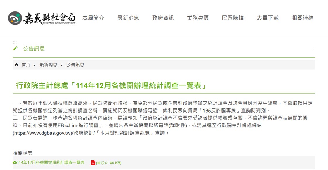 本次調查由社會局委託趨勢民意調查股份有限公司辦理,調查期間為114年12月至115年2月,面對面訪問設籍嘉義縣65歲以上長者及55歲以上原住民。為讓長輩安心受訪,訪問期間皆規定訪員需攜帶單位識別證、佩戴識別證及公文,長輩如接獲調查約訪,請協助配合接受訪談。