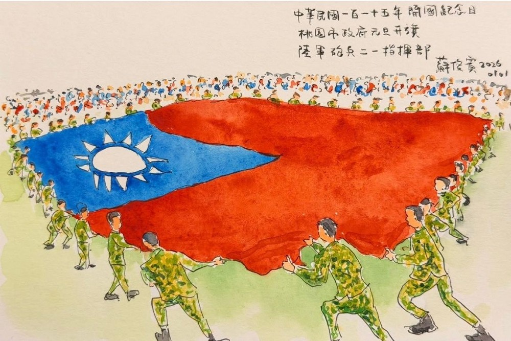 蘇俊賓表示,今年元旦升旗典禮中,最令他印象深刻的畫面,莫過於駐守在平鎮區的陸軍砲兵第二一指揮部,官兵齊心協力撐起巨幅國旗的瞬間,展現國軍堅定、團結的精神。返家後,他將這份感動化為畫作並分享於臉書,感謝所有參與人員精彩的表現。