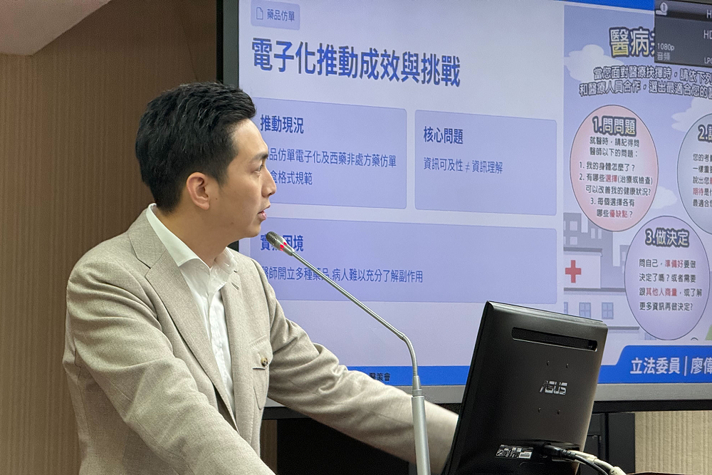 食藥署近年推動「藥品仿單電子化」及「西藥非處方藥仿單外盒格式與規範」,希望讓藥物資訊更容易取得。立委廖偉翔今(19)日則指出,「資訊可及性」並不完全等於「資訊的理解」,尤其兒童精神科用藥涉及的資訊相當複雜,單靠家長自行查閱仿單,仍難以完整掌握用藥風險,因此醫病共享決策(Shared Decision Making, SDM)的推行相當重要。