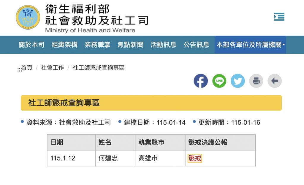 曾獲衛福部「績優督導」表揚的高雄市衛生局心衛中心執行秘書何建忠,涉嫌利用職務權限挑選脆弱個案的未成年少女性侵,事後還透過於任職社會局的太太查詢偵辦進度,遭檢方起訴。衛福部社會救助及社工司副司長楊雅嵐今(21)日證實,懲戒結果已出爐,廢止何建忠的執業執照及社會工作師證書。而衛福部也正式設置「社工師懲戒查詢專區」,供外界查詢,目前榜上只有何建忠。
