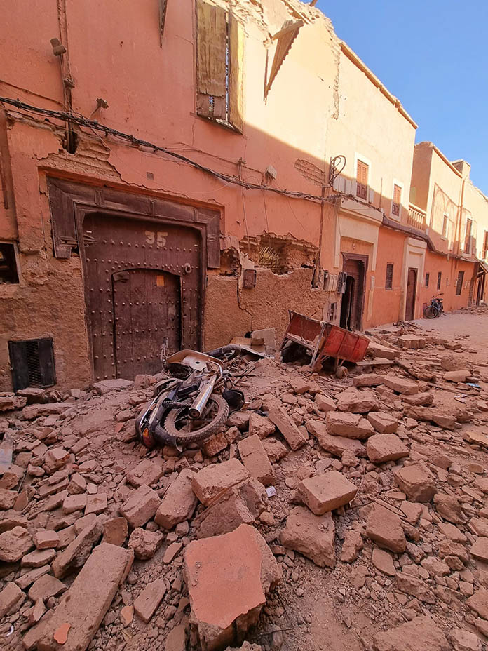 摩洛哥這起強震的震央位於觀光勝地馬拉喀什市西南方72公里處,深度僅18.5公里,強震摧毀阿特拉斯山脈(Atlas Mountains)整片村落,尤其震央附近村落傷亡慘重,當地房屋被震成斷垣殘壁,現場宛如經歷過炸彈攻擊,整條街甚至完全被毀,瓦礫堆中飄出屍臭。