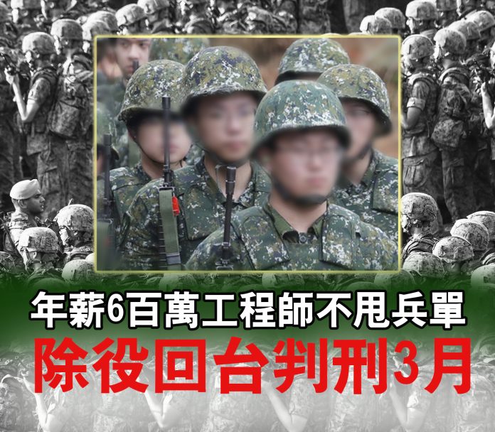 台中市北屯區一名36歲劉姓男子,16歲出國讀書後就沒回過台灣,即便收到兵單,他也選擇忽視,直到除役後數年才返國處理,台中地院審理時,考量他犯後坦承、態度尚佳,且沒有不良前科,現為數據工程師,年薪台幣586萬元,依妨害兵役罪判他3個月,得易科罰金,可上訴。