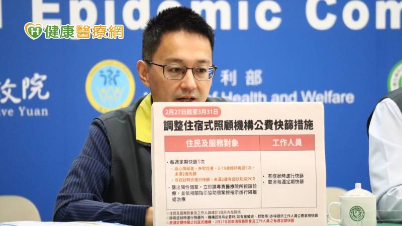 因此,指揮中心宣布,原先住宿式照顧機構住民須每週快篩兩次,工作人員則須快篩一次的相關規定,自2月27日起,調整為住民及服務對象每週定期快篩1次,有症狀時亦進行快篩;工作人員取消定期快篩,改為有症狀時進行快篩。