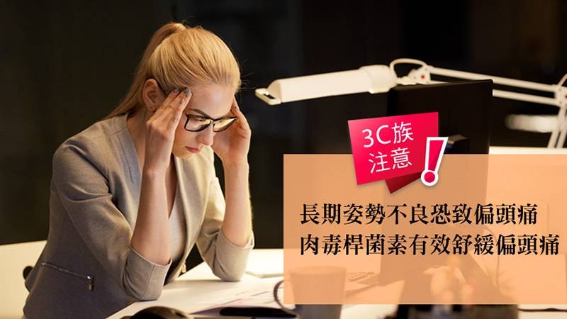 陳信宏醫師指出,因長期姿勢不良而導致偏頭痛的3C族群,幾乎都會有肌肉過於緊繃的問題,所以要放鬆肩頸區域的肌肉(如:斜方肌、胸鎖乳突肌等)才能改善頭痛問題,將肌肉放鬆後較不會壓迫神經導致發炎而引發頭痛,能定期施打肉毒桿菌素來緩解頭痛,同時也會感覺肩頸比較不會那麼僵硬了。此外,使用3C一定要適時休息、做些舒緩活動,對於肌肉緊繃都能有些微的改善效果,還能透過物理治療或是舒緩按摩等方式,來放鬆肌肉、舒緩頭痛。