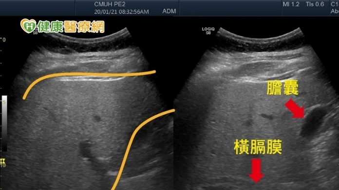 ▲2條黃色線內是肝臟的範圍,肝臟因堆積較多脂肪,導致超音波下肝臟是白花花一片,箭頭處為膽囊與橫膈邊界變得模糊,是重度脂肪肝的影像表現。(圖/中國醫藥大學附設醫院提供)