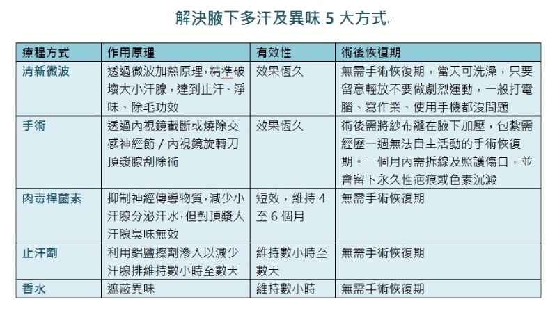 黃耀立說明,傳統手術包括內視鏡截斷或燒除交感神經節、內視鏡旋轉刀頂漿腺刮除術,原理是把頂漿腺刮掉;新型清新微波則是用物理性能量破壞汗腺,對於患者沒有侷限性,即使小孩也可進行。
