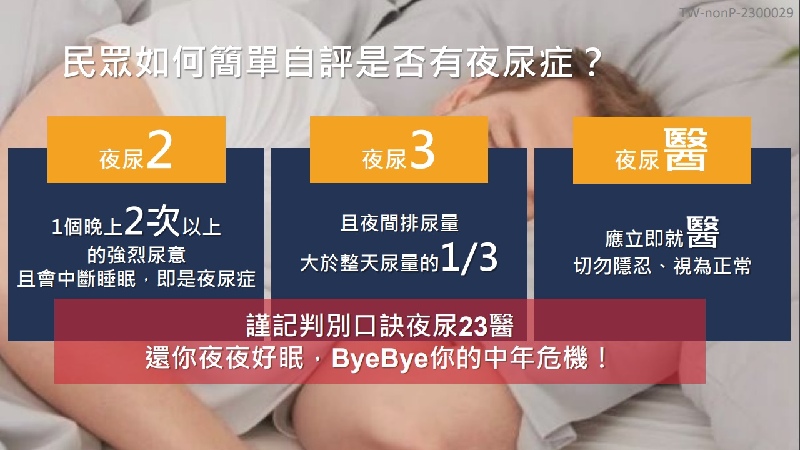為方便民眾快速發現夜間排尿問題,學協會共推「夜尿23醫,ByeBye中年危機」口訣,簡易檢查排尿狀況: