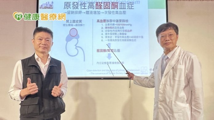 王子源指出,高血壓病人通常須終生服藥來控制血壓,以減少心血管疾病的併發症。台灣有9成高血壓是屬於原發性高血壓,病人只要按時服藥,掌握血壓應無大礙。但有10%的病人是續發性高血壓(全台約53萬人),也就是另有病因才導致血壓偏高,其中最常見的就是「原發性醛固酮過高症」,因腎上腺生產過量醛固酮,造成腎素水平下降而導致的疾病,跟基因、長期服用類固醇藥物相關,容易在中年時就發生中風。