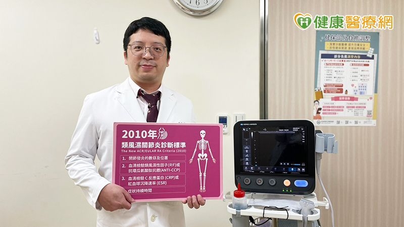 蔡凱倫醫師表示,類風濕性關節炎疾病進展相當緩慢,民眾不易察覺,建議平時可透過333法則先自我評估,若關節疼痛部位超過三個;晨間僵硬超過30分鐘以上及關節疼痛超過三週,就應立即就醫檢查。專科醫師在診斷時會參考2010年歐美風濕病學會的建議,評估患者症狀持續時間是否大於六週、關節侵蝕位置程度及患者抽血的發炎指數(例如:類風濕因子、抗環瓜氨酸肽抗體anti-CCP…等)來做綜合判斷,並透過X光片、核磁共振或骨骼肌肉超音波詳細檢查是否有關節侵蝕現象,其中骨骼肌肉超音波檢查在診間就可以進行,大幅縮短疾病診斷時間。