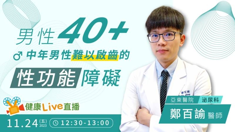 不只女性有更年期,男性也有更年期,大部分男性年過40歲開始陸續出現膀胱無力、夜間頻尿、性生活次數下降等問題,嚴重影響到日常生活。而對男性來說,性功能障礙更是個難以開口的問題,所以本集《健康Live直播》特別邀請亞東醫院泌尿科鄭百諭醫師來與我們聊聊中年男性性功能障礙的問題,希望幫助男性重拾自信。