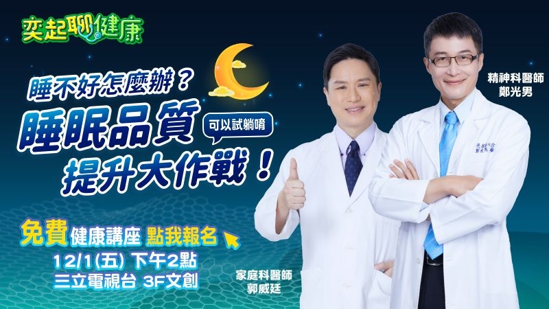 【健康醫療網/編輯部整理】失眠容易疲勞、沮喪,工作也無精打采。但睡眠不足真的會引起免疫減弱、抵抗力降低並容易感染嗎?二度榮獲健康醫療報導獎的三立網路節目《奕起聊健康》,為民眾困擾的失眠議題舉辦免費健康講座,邀請到精神科醫師鄭光男以及家醫科醫師郭威廷共同開講。點出睡不好的原因百百種,教你如何戰勝失眠問題。