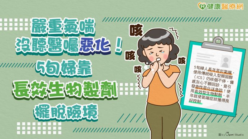 【健康醫療網/記者鄭宜芬報導】一位5旬婦人長年苦於氣喘,使用傳統吸入型類固醇(ICS)仍咳個不停,調高吸入型類固醇劑量合併兩種支氣管擴張劑,療效仍不理想,且年紀大行動不便需兒女陪伴就醫,婦人備感灰心不願回診,竟引發急性惡化送急診!高雄市立小港醫院胸腔內科醫師鄭至宏為婦人申請健保給付長效型生物製劑,半年就使氣喘症狀獲 得 良好控制,終於拋開口服類固醇讓治療更方便,不再造成兒女負擔。