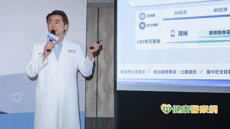 新式老花雷射LBV(Laser-blended vision)則是利用150度雙眼視差加上球面像差原理,加上150度延長景深,讓近距離用眼的能力表現更好,創造雙眼融像區,不犧牲影像的立體度與色彩飽和度。術前須進行完整的醫療評估,經由驗配視差、模擬術後生活,確保熟齡族順利脫鏡。新術式後對比度穩定,增加雙眼景深、立體感好,遠中近皆能看。