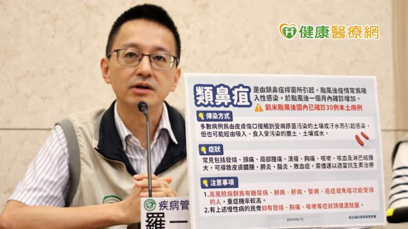 類鼻疽是由類鼻疽桿菌所引起的疾病,該菌存在於土壤、水池及積水環境中,主要由皮膚傷口接觸受病原菌污染的土壤或汙水傳染,而颱風後因強風暴雨易使土壤和泥水中的類鼻疽桿菌暴露於地面並更易傳播,且常為吸入性感染,造成颱風後一個月內確診個案增加。