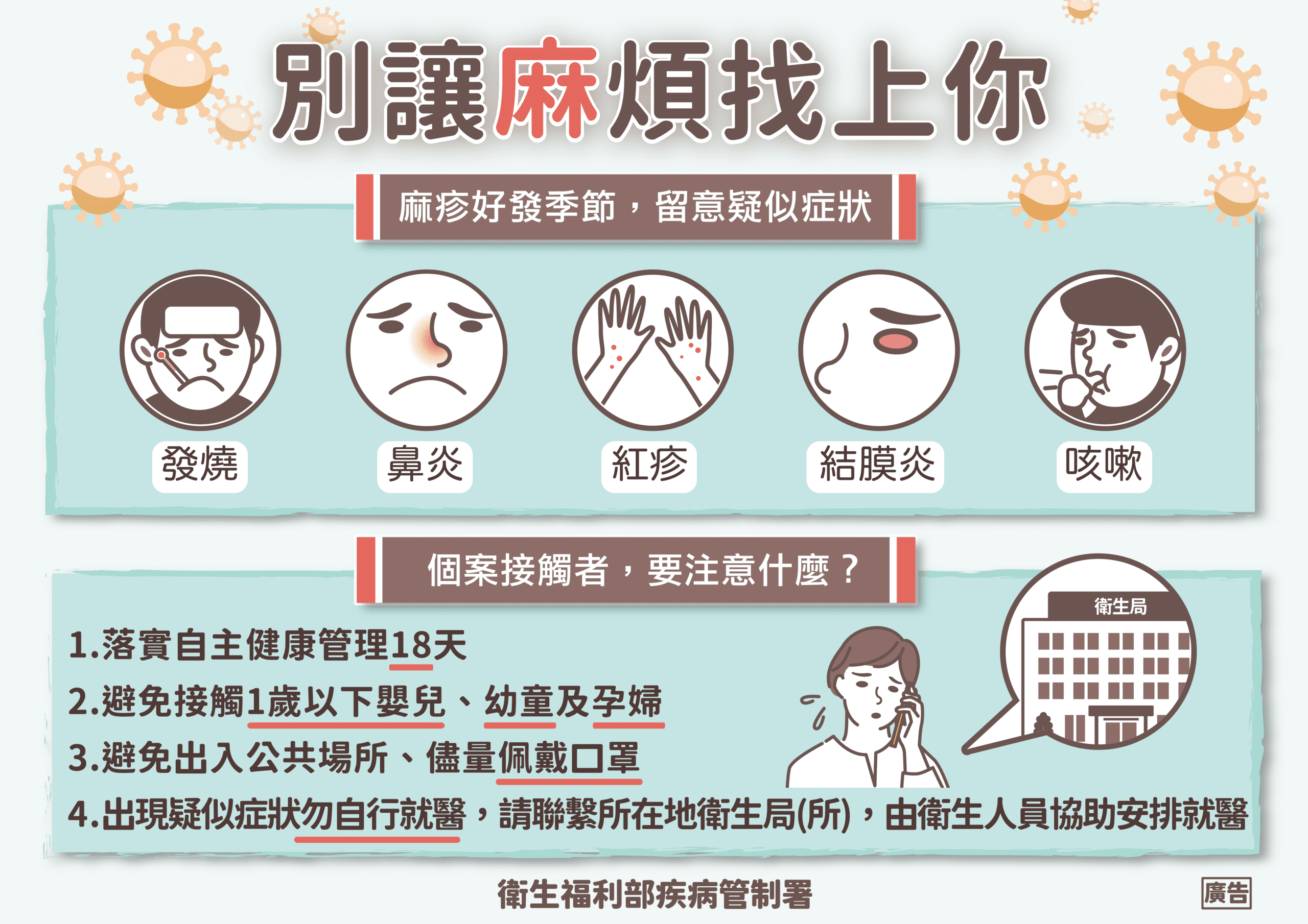 衛生局表示,麻疹病毒主要透過空氣傳播,接種MMR疫苗是預防麻疹最有效的方法,家中如有年滿1歲幼兒,請儘速帶到衛生所或預防接種合約院所接種麻疹、腮腺炎、德國麻疹混合疫苗(MMR),避免帶未滿1歲或未接種MMR的幼兒至流行地區。建議1981年(含)以後出生者,如需前往東南亞國家等流行地區,可經醫師評估接種疫苗後再出國,以降低感染風險。