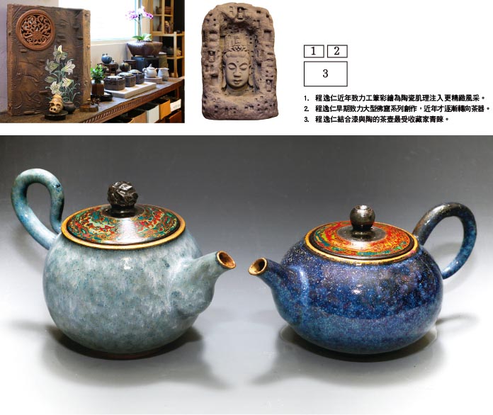 在世貿茶展會場曾以「台灣茶器的西進」為題演講,還以我2012年出版、熱銷兩岸的《台灣茶器》一書為例,程逸仁說當時對岸深受影響而逐漸掀起搶購台灣壺熱潮,他才毅然轉型,從此專注茶器的創作:從蟲蛀茶碗、龍紋香器,到今天以自己最擅長的釉色為骨,不斷結合漆藝、蛋殼、金釉等多元媒材成就的鑲貝漆陶壺、變塗漆陶壺、斑駁鎏金壺、鋼鐵、志野等系列,多變的風貌與藏色繽紛的風韻,不斷有令人驚喜的表現,在兩岸都深受肯定。