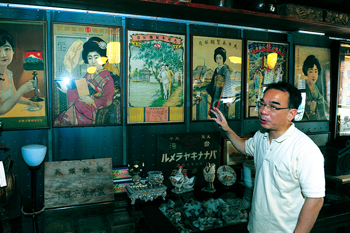 牆上還有許多日據時期的豪華客船,其中「高千穗丸」,是一艘由日本航向台灣基隆的商船,卻有「日本鐵達尼」之稱,在一九四三年在基隆外海彭佳嶼東北方遭被美方的魚雷擊沉,船客和船員在內,罹難者共八百四十四名。收藏許多老照片、菸酒告示、電影海報、商店掛飾、公仔、童玩、彈珠台、石雕,還有手搖式老裁縫車、菸盒、酒的商標、老酒瓶、火警鐘,井然有序地收藏在玻璃展示櫃裡。每件物品都是台灣早期曾用過的東西,和當年的社會息息相關,它們似乎走過過去的生活、活在現在的生命之中,像是件件有故事的活字典。