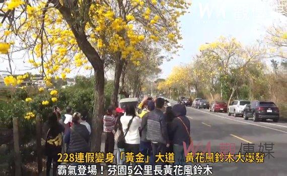 (觀傳媒彰化新聞)【記者陳雅芳/彰化報導】近似於喇叭、風鈴狀的花型會在花期時開滿樹梢,沒有綠葉相襯,艷黃色的花朵恣意綻放,這就是黃花風鈴木,彰化縣芬園鄉彰南路1段到3段兩側,種植長達5公里的黃花風鈴木,228連續假期黃花怒放,黃澄澄一片也讓芬園彰南路冠上「黃金大道」美名,芬園鄉長林世明說,黃花風鈴木的開花期僅有十天,若要前往賞花的民眾要把握時間。