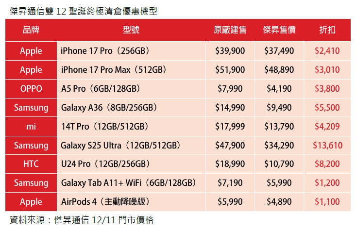 傑昇通信表示,雙12搭配聖誕節的重頭戲,各大通路無不卯足全力釋出優惠吸客,可望催出年末換機潮。備受矚目的蘋果iPhone 17系列無疑是關注重點,像是iPhone 17 Pro(256GB),雙12優惠期間現省2410元;超夯單機iPhone 17 Pro Max(512GB)更是結帳立即折抵3010元,連同AirPods 4(主動降噪版)也只賣4890元,這次優惠力度超有感。
