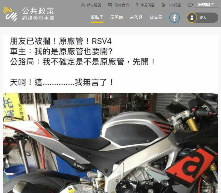 民眾在「公共政策網路參與平台」上提議,希望有關單位檢討現行車輛改裝之相關規定。(圖/翻攝公共政策網路參與平台「車輛改裝合法性事宜」提案)