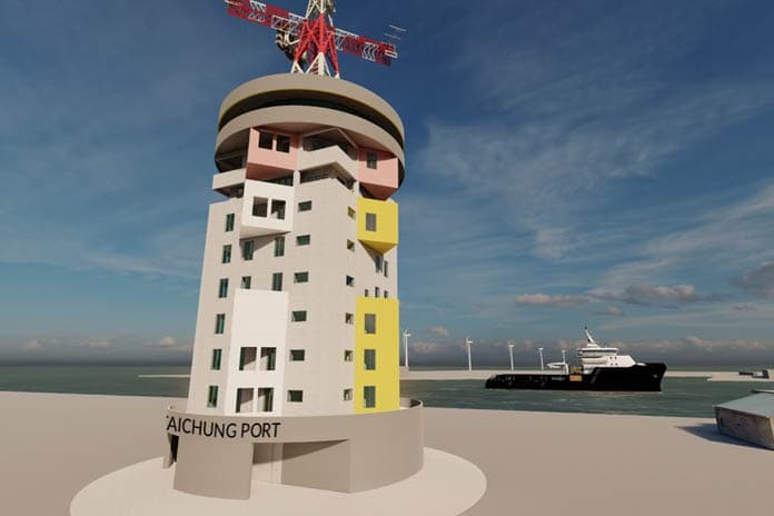 另一方面,建築師依據原建築形態八角星-兩個正交的方形,進行外牆意象色彩計畫,外牆突出方形以黃色系代表生生不息的活力與朝氣、紅色系代表渴望不斷進步的企圖心、藍色系代表寬宏的氣度與善於溝通的手腕等三種顏色,整體基底輔以中性之水泥色(白色、深灰色)為基底,凸顯建物之交錯感,以簡單線條帶出建築量體錯落感,線條亦代表著指引八方之光芒,如羅盤、船舵指引著前進的方向,寓意信號台將在此地永續服務、永續守候著我們的臺中港。