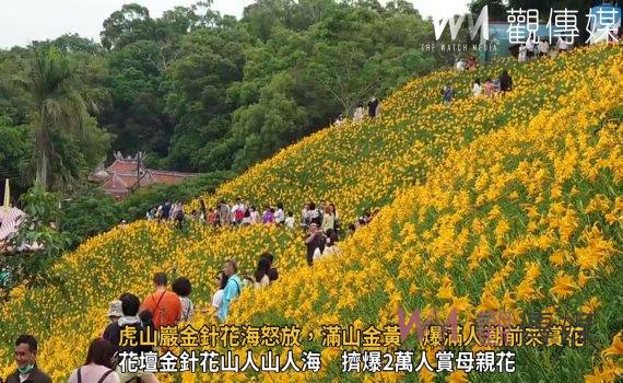 (觀傳媒彰化新聞)【記者陳雅芳/彰化報導】花壇鄉虎山巖金針花海怒放,滿山金黃,美不勝收,今(14)日是母親節,吸引許多親子陪同母親來欣賞「母親花」,現場湧入逾2萬人,打破歷年記錄,虎山巖說,金針花又稱萱草、忘憂草,有「母親花」之稱,今年因為缺水,金針花較去年晚開約10天,今天母親節達到最高峰,由於氣候宜人,因此吸引爆滿人潮前來賞花。