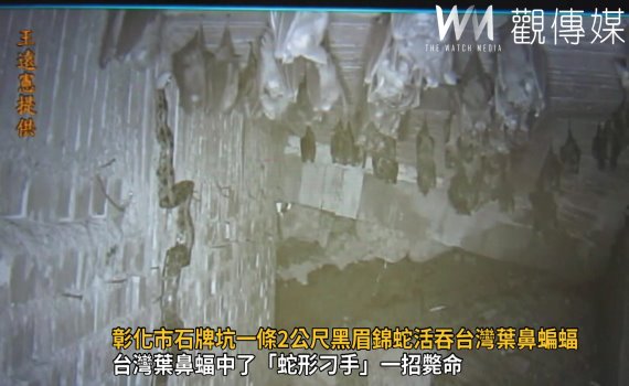 ▲彰化市石牌坑一台灣葉鼻蝙蝠洞穴遭一條長約2公尺的黑眉錦蛇偷襲,黑眉錦蛇活吞母蝠,過程都被全程記錄,讓人看得驚心動魄。