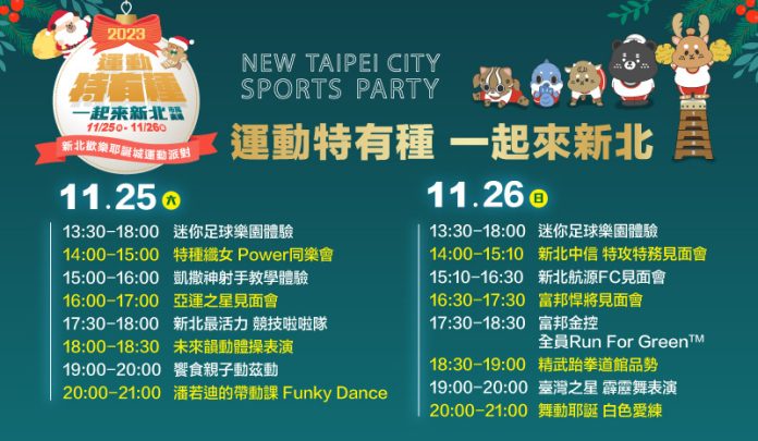 每年新北歡樂耶誕城廣受市民好評的運動派對,今年以「運動特有種 一起來新北」為主題,邀請民眾11月25日至26日來新北市民廣場嗨翻新北歡樂耶誕城。新北中信特攻、新北中纖女排、富邦悍將、新北凱撒射箭,以及新北航源FC足球等新北城市隊將與大家近距離互動。還有最夯的亞運之星見面會!各項豐富的運動體驗與精采的舞臺節目不能錯過!舞臺活動有美麗的修德國小韻律體操隊、大專啦啦隊錦標賽常勝軍-輔大競技啦啦隊、最年輕的8歲霹靂舞國手並榮獲法國BATTLEPRO及韓國BBIC Powermove兩項冠軍的林李納(NANA)與舞團一起大獻舞技!精彩陣容都在新北歡樂耶誕城運動派對與大家見面喔!