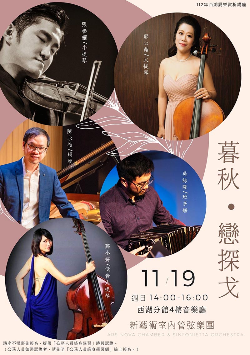 西湖分館表示,本場愛樂講座邀請成立至今受邀舉辦過近百場音樂會的「新藝術室內管弦樂團Ars Nova Chamber & Sinfonietta Orchestra」蒞臨,用解說式的室內樂音樂會方式,在曲目演奏前,由演奏家解說曲目的背景知識,民眾除了可以欣賞現場演奏,更能從聆賞解說裡瞭解演奏曲目的創作內涵和特色。透過Live版音樂會與民眾來一場探戈音樂的對話,現場將由郭心蘋演奏大提琴、張譽耀演奏小提琴、鄭小妍演奏低音大提琴、陳永禎演奏鋼琴及吳詠隆演奏班多鈕,活動精采可期,愛樂的朋友們不妨相邀一起聆賞這場室內樂。