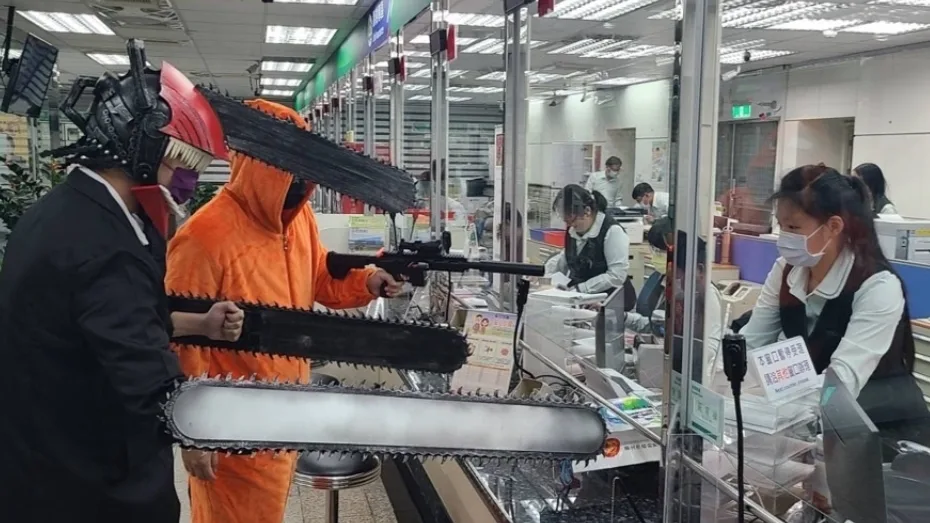 警方準備變裝道具,提升防搶演練的能見度,藉由男警飾演一位經營餐廳的老闆因疫情關係導致無法經營積欠債務,無力償還,因而變裝「鏈鋸人」持槍行搶後,馬上由接應的同夥將贓款拿走騎乘機車逃離現場,該分局線上警力在接獲通報後,立即趕往現場,根據行員提供歹徒特徵及逃逸方向進行追緝,經由通報攔截圍捕警力及時 將歹徒制伏。