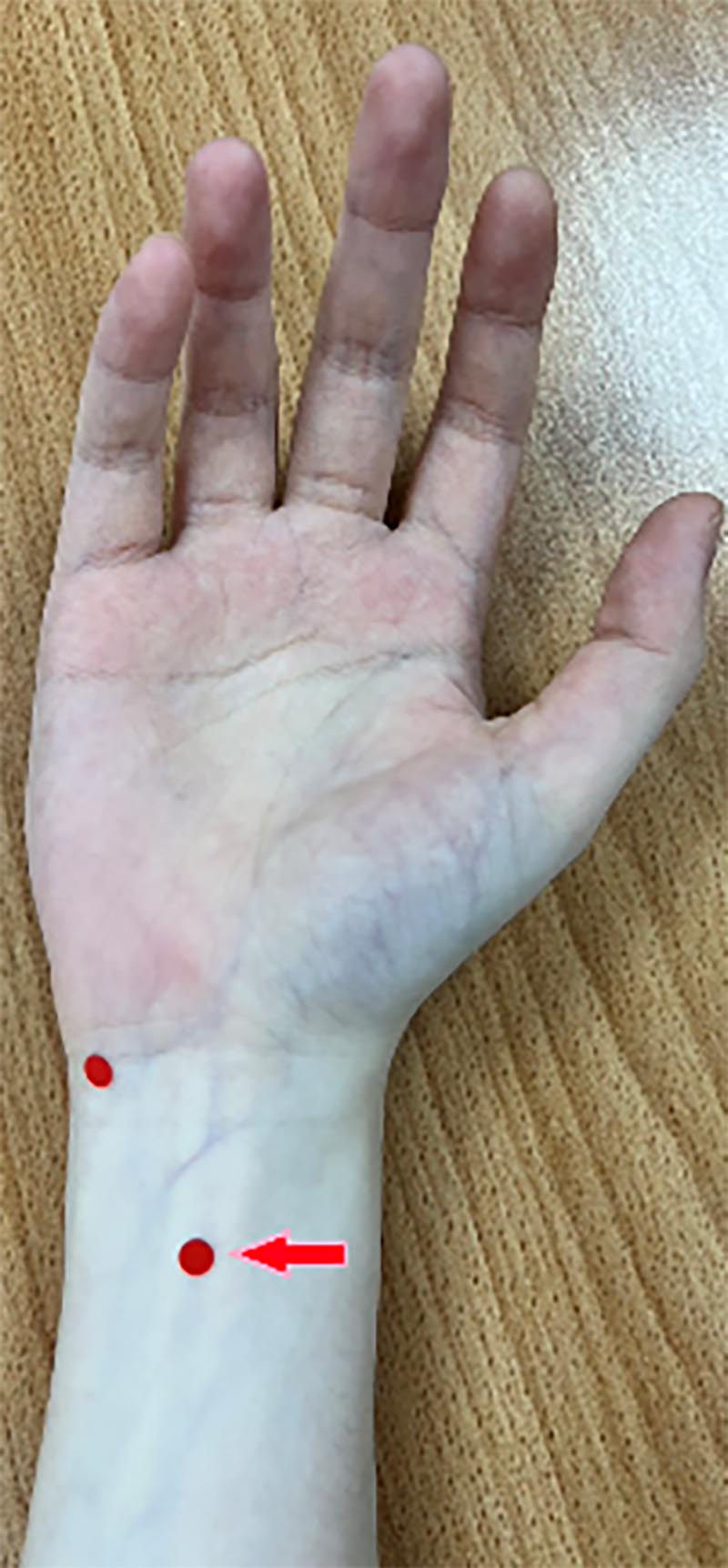 - 內關:位於手掌側,手腕橫紋中點往上約3橫指距離處,適用胃脹氣、胃痛、噁心等。