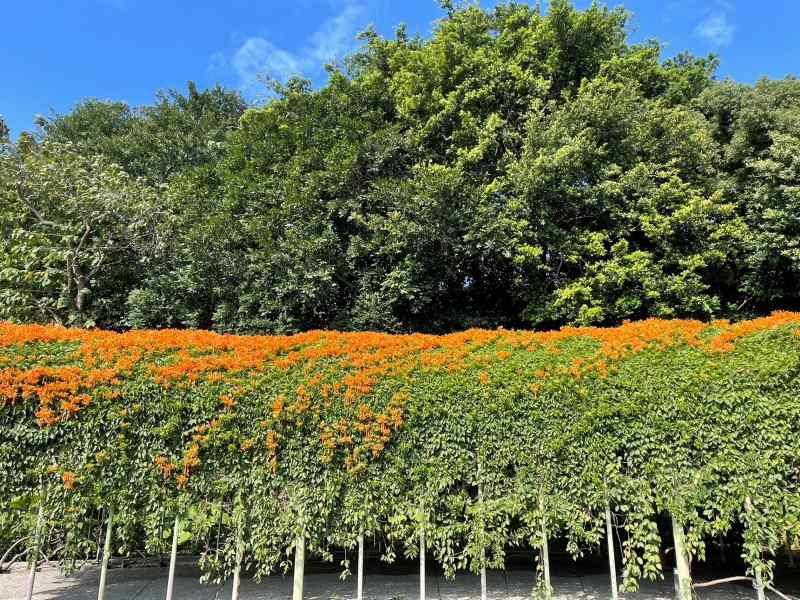 公園處圓山所楊國瑜主任表示,紫葳科的炮仗花,又稱「炮竹花」、「炮仗紅」、「火焰藤」,每年的春天就是迎接炮杖花季的時節,纍纍花串猶如喜慶燃放的鞭炮而聞名,炮仗花的花語具有富貴吉祥的寓意。炮仗花屬攀緣灌木,花型呈長筒狀,頂端四裂,而且裂片會反捲,圓錐花序,每個花序約有20至30朵花。炮杖花的花朵極具觀賞價值,亦可當屋頂、牆壁遮蔭使用,因此常做為園藝造景用花牆及廊道綠化植物。炮仗花也屬蜜源植物,吸引蜜蜂忙碌穿梭採蜜,呈現春天生機盎然的景緻。從圓山捷運站1號出口,就能發現超吸睛的橘黃花海瀑布,沿途是平坦的路面,方便輪椅族、推車族及年長者前往賞花。花都開好了,千萬不要錯過這難得的機會!!