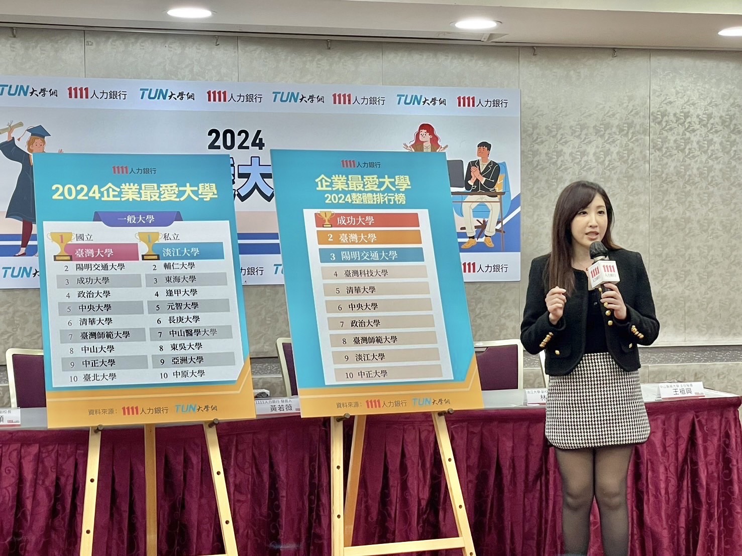 另外,1111人力銀行與TUN大學網合作「2024企業最愛大學調查」,針對有選才、用才權力的企業負責人、主管、人資進行抽樣調查,藉以探知就業市場輪廓。調查項目包括「整體表現排行」、「公私立大學排行」、「公私立科技大學排行」以及「18學群排行」。