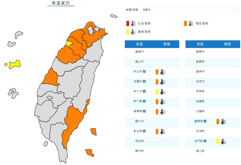 天氣高溫炎熱,今(23)日新北市、桃園市、新竹縣、苗栗縣、彰化縣、臺東縣為橙色燈號,有連續出現36度高溫的機率,請加強注意。新竹市、金門縣為黃色燈號,請注意。