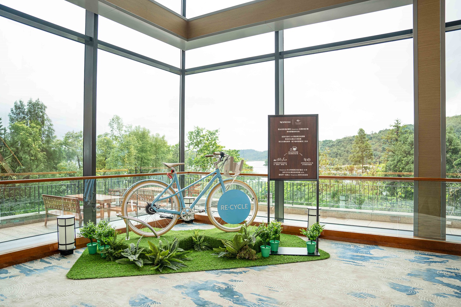 ▲雲品溫泉酒店響應Nespresso回收計畫,並於飯店公共空間展示以回收咖啡膠囊打造的循環自行車。