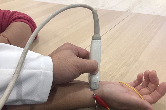 確定病人疼痛點後,骨科醫師先以超音波儀器定位受損的神經通行路徑,再由中醫師施針,加上直流電電療,可以集中刺激受損神經,減少受損組織沾黏,助改善症狀。