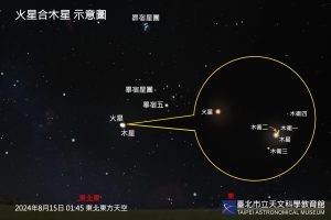 8月15日(四)凌晨1時將發生「火星合木星」,為今年可欣賞的「行星合」中兩星最相近的一次,相距僅0.31°比滿月視直徑還小,這也是兩星2018至2033年間在夜空中最接近的時刻,不過雖然在視線上相近,它們之間的實際距離超過5億7,000萬公里!當晚0.8等的火星與-2.2等的木星,一紅一黃在凌晨1時左右由東方升起,到天亮前以肉眼觀看都十分接近,若透過雙筒望遠鏡觀察還可看到木星及其四大衛星與火星同框的奇妙景象。
