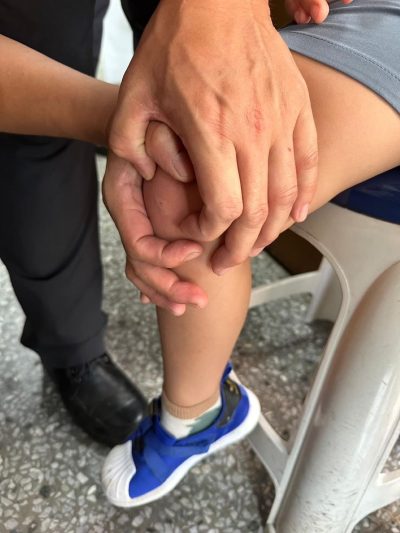 黃姓先生(76年次)日前帶小男童急忙衝向派出所請求協助,員警立即查看後發現黃姓小男童右腳膝蓋上有紅腫及明顯遭蜜蜂螫傷之傷口。小男童因受劇痛驚嚇,嚎啕大哭,面色慘白,員警現場先安撫小男童,隨後所長李弘翔及警員王勇智立即帶黃姓父子至大湖消防分隊向消防員告知小男童遭蜜蜂螫傷情形,經初步清消後並無大礙,並協助引導黃姓父子上救護車,送往三軍總醫院進行治療,黃姓父親表示非常感謝大湖所員警協助及耐心安撫受驚嚇的小男童。