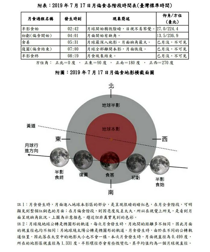 7月17日為農曆15日,滿月,該日凌晨至清晨將發生月偏食,在天候許可時,臺灣各地於凌晨的西方天空,將可見到月面逐漸有缺角而後月沒的月沒帶食現象。中央氣象局表示,本次月偏食於臺灣時間17日2時42分由「半影食始」揭開序幕,皎潔的月面自東稍偏北側逐漸略微黯淡,起初目視不易察覺,而後逐漸明顯;偏食開始於4時1分「初虧」,此時明顯可見月面的東北側開始有缺角,之後缺角逐漸擴大;5時31分「食甚」,是本次月食缺角最大的時候,缺角約佔月面的66%。由於臺灣各地於5時15~31分間陸續月沒,這種月食過程中月沒的現象稱為月沒帶食,也因為月已沒入地平線,因此本次月食「食甚」及其後之偏食過程在臺灣將無法見到,各重要階段時間、視角及方位詳如附表。
